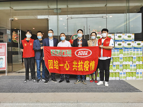 4月14日上午,百县万品携手义乌乐享食品商行为奋战在防疫一线的工作人员送去了价值20万元的爱心物资。