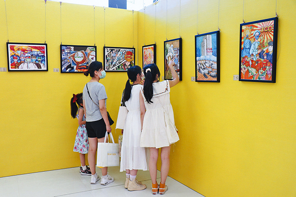 医护人员与群众同心抗疫的温暖画面、绘有“义乌欢迎你”的国粹绘画、关于北京天安门、义乌鸡鸣阁等地标性作品……现场,琳琅满目的青少年优秀绘画作品让人眼花缭乱。