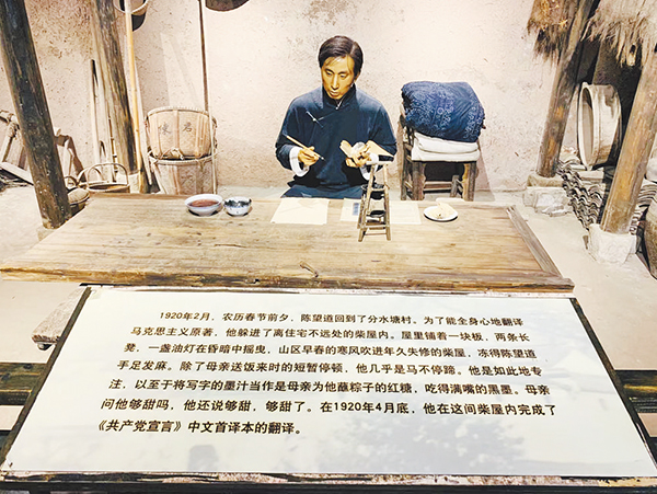 16字书阵、巨幅党旗、《共产党宣言》中文全译本首译地,置身分水塘村,就会被浓郁的红色文化氛围感染。进入陈望道故居,去探一探望道先生的人生足迹,品一品“真理的味道非常甜”;去初心承诺厅书写承诺,重温入党庄严时刻;去宣言诵读厅,感受信仰的力量;去老街的望道红色主题邮局,挑选心仪的“红色记忆”……