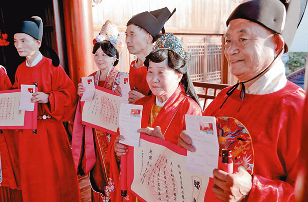 在蒲川水街的老戏台上,参与活动的夫妻在司仪的引导下,依次行洗尘之礼、登堂之礼、三拜仪式之礼等,市民政局、佛堂镇为参与活动的夫妻颁发结婚证以及定制的传统中式婚书,10对老夫老妻重新领证。