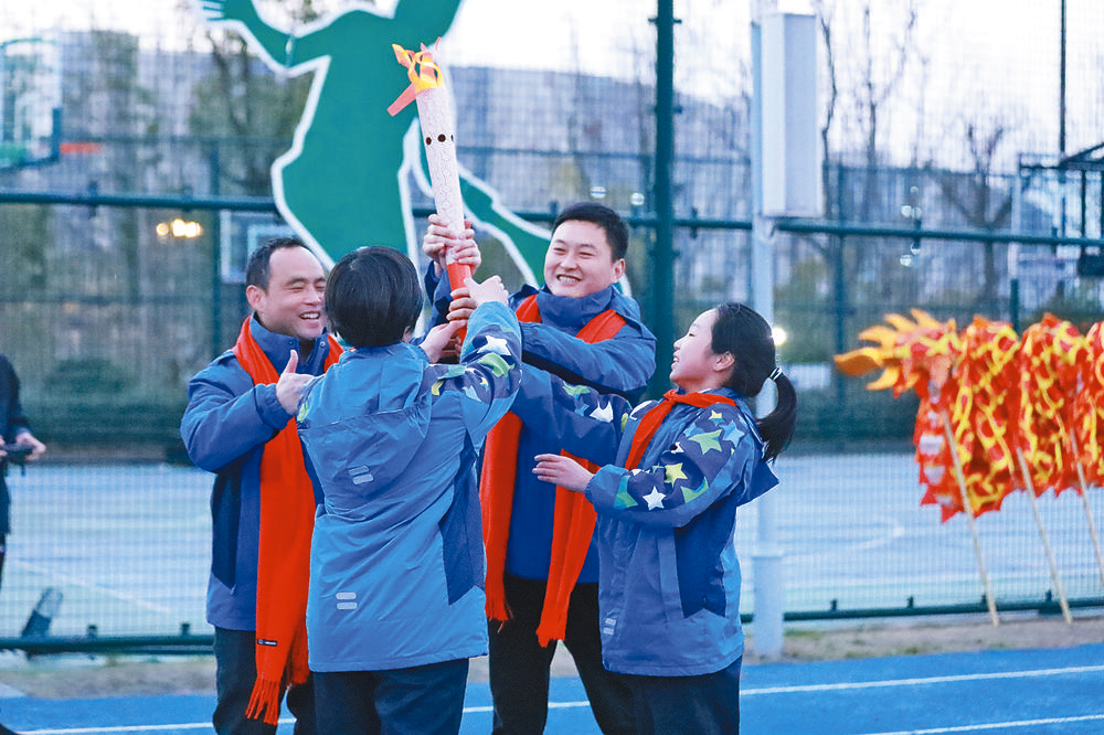 据悉,为迎接亚运、助力亚运,义乌市新丝路学校开展了“我与亚运”知识竞赛、“我与亚运”漫画作品大赛、小小运动达人秀短视频大赛等主题教育实践活动。图为师生在校园内传递自制的火炬。(张云飞 张超伟)