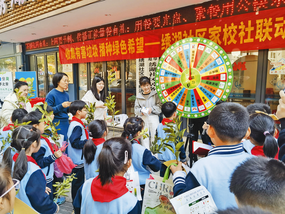 近日,绣湖社区携手绣湖小学,举行“收集有害垃圾,播种绿色希望”家校社联动活动。活动现场,社区工作人员详细讲解垃圾分类知识,并寓教于乐,通过“垃圾分类大转盘”游戏,检验小学生对垃圾分类了解程度。此外,孩子们还拿出过期药品、废电池、废灯管等有害垃圾,进行垃圾分类投放,正确完成后,从工作人员处换取一株绿油油的柑橘苗。(林晓燕 龚双妍)