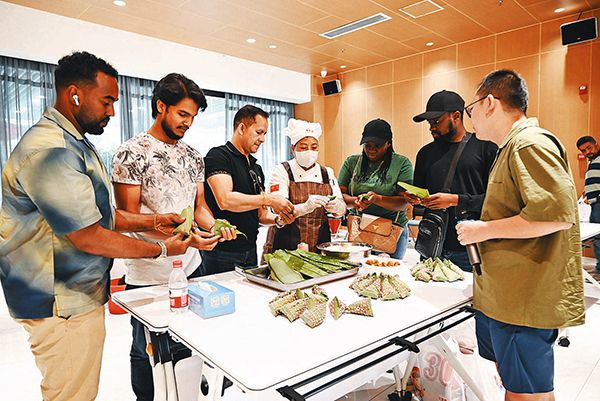昨日下午,在义乌国际商贸城四区一楼采购商服务中心,来自俄罗斯、伊拉克、印度、也门、韩国、喀麦隆、埃塞俄比亚等国的常驻义乌外商欢聚一堂,饶有兴趣地与我市相关部门的工作人员一起包粽子、做香囊,感受中国传统节日——端午节的文化魅力。